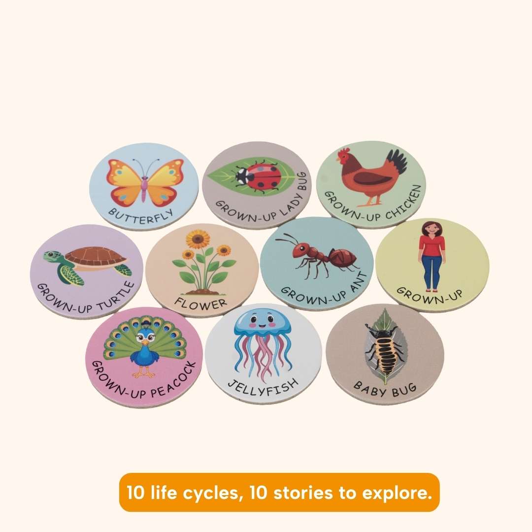 For older kids, mix 2–5 life cycles and place the discs face down. Take turns flipping four cards at a time and match all four stages of a life cycle to find a complete set. Once completed, check with the story card and celebrate the win!